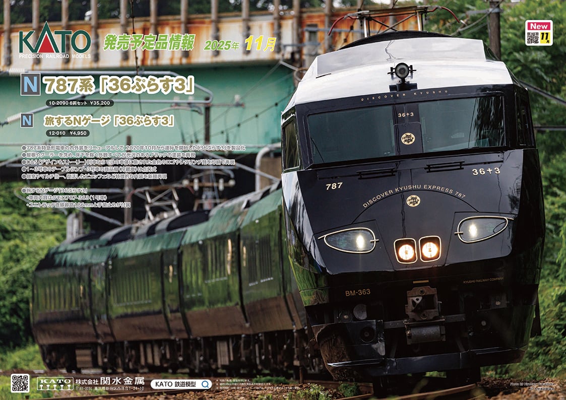 定価 35,200円(税込)<BR>●787系「36ぷらす3」はJR九州のD&S(デザイン&ストーリー)列車第12弾として、787系のうち1編成を改造して令和2年(2020)10月から運用を開始しました。木曜日から月曜日にかけて九州7県を反時計回りで一周する運用で、各日の運転区間ごとに乗車ができる観光特急となっています。改造にあたり内外装全てをデザインし直し、外装は既存の787系のイメージとは異なる光沢のあるブラック塗装に金色の装飾を施した車体となりました。また、車窓を眺めることよりも乗車体験そのものの価値を重視しており、障子などをふんだんに使った窓、全車グリーン車化されて全体に木目を生かした内装などが特徴です。また787系として17年ぶりにビュッフェが復活し、飲料や軽食、お土産やグッズの販売が行われています。<BR><BR>◆九州を5日間かけて周回する観光特急「36ぷらす3」が<旅するNゲージ>で登場いたします。外国人観光客には日本観光の記念品として、また国内のユーザー様にも旅の思い出に浸っていただける製品としてオススメです。<BR><BR>◆令和2年(2020)10月より運行を開始した人気の観光列車「36ぷらす3(さんじゅうろくぷらすさん)」は5日間かけて九州全域を走行し、各地で様々な車両たちと顔を合わせます。〈10-2047/2048 813系2200番代〉や〈10-1952 885系(2次車)<アラウンド・ザ・九州>〉など九州地域で活躍する車両製品と併せてお楽しみいただけます。